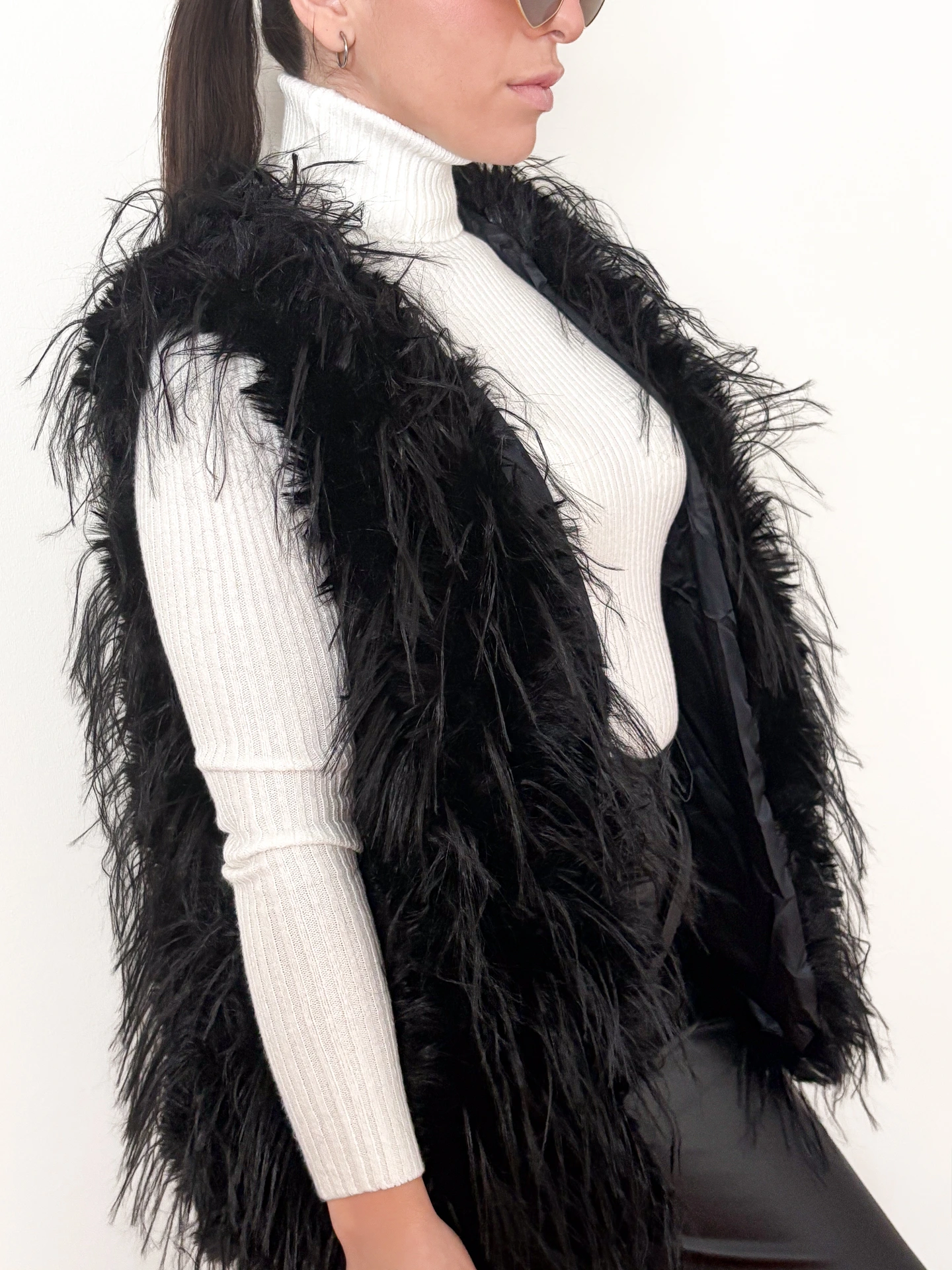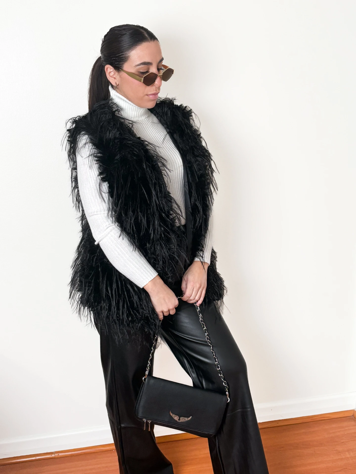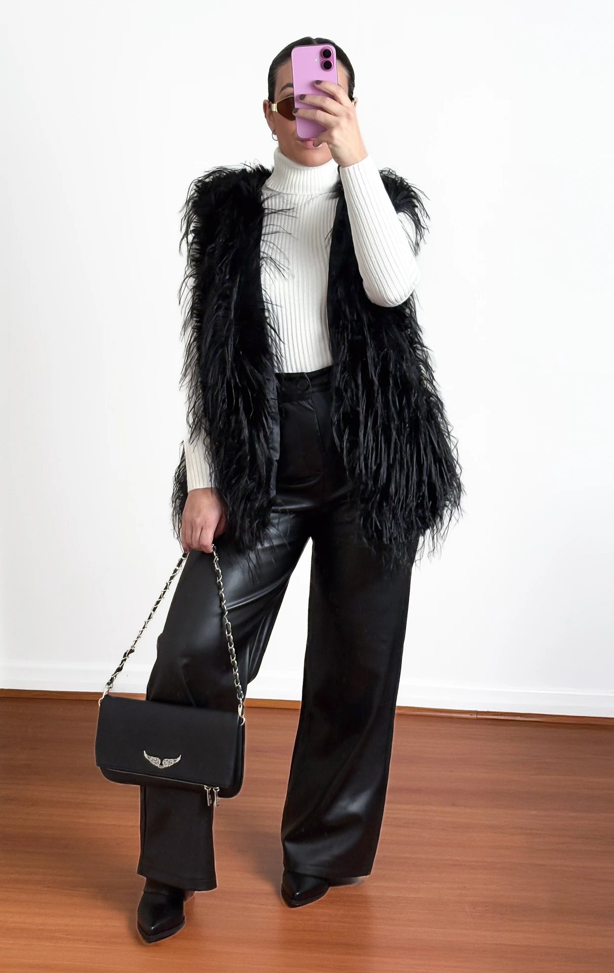 El Chaleco Jame de Bloomsy es esa prenda statement que transforma cualquier outfit. Su textura peluda en color negro y su corte sin mangas lo hacen perfecto para superponer sobre camisas, poleras o sweaters. Ligero pero con presencia, suma volumen visual sin abrigar en exceso, ideal para looks urbanos o de noche.